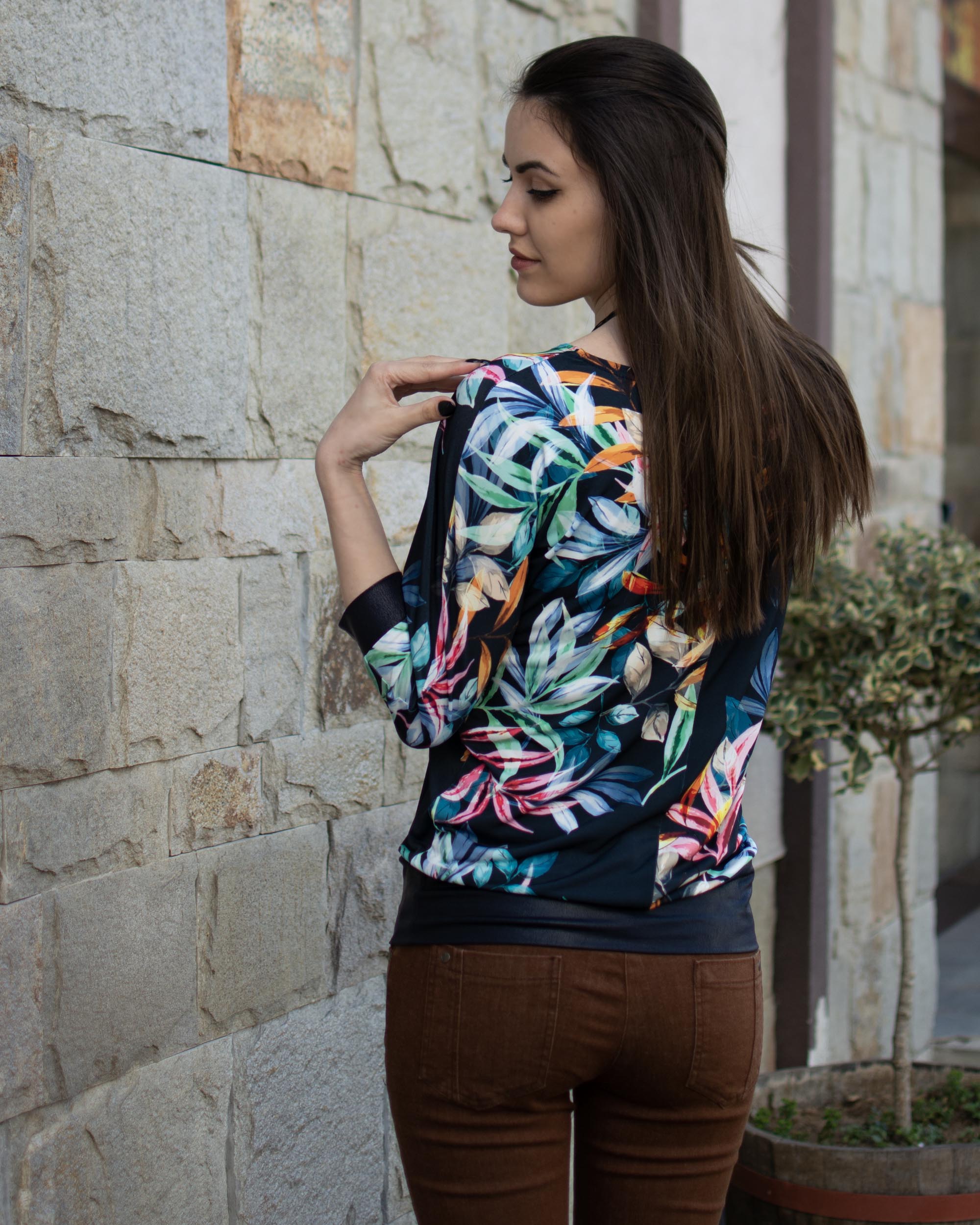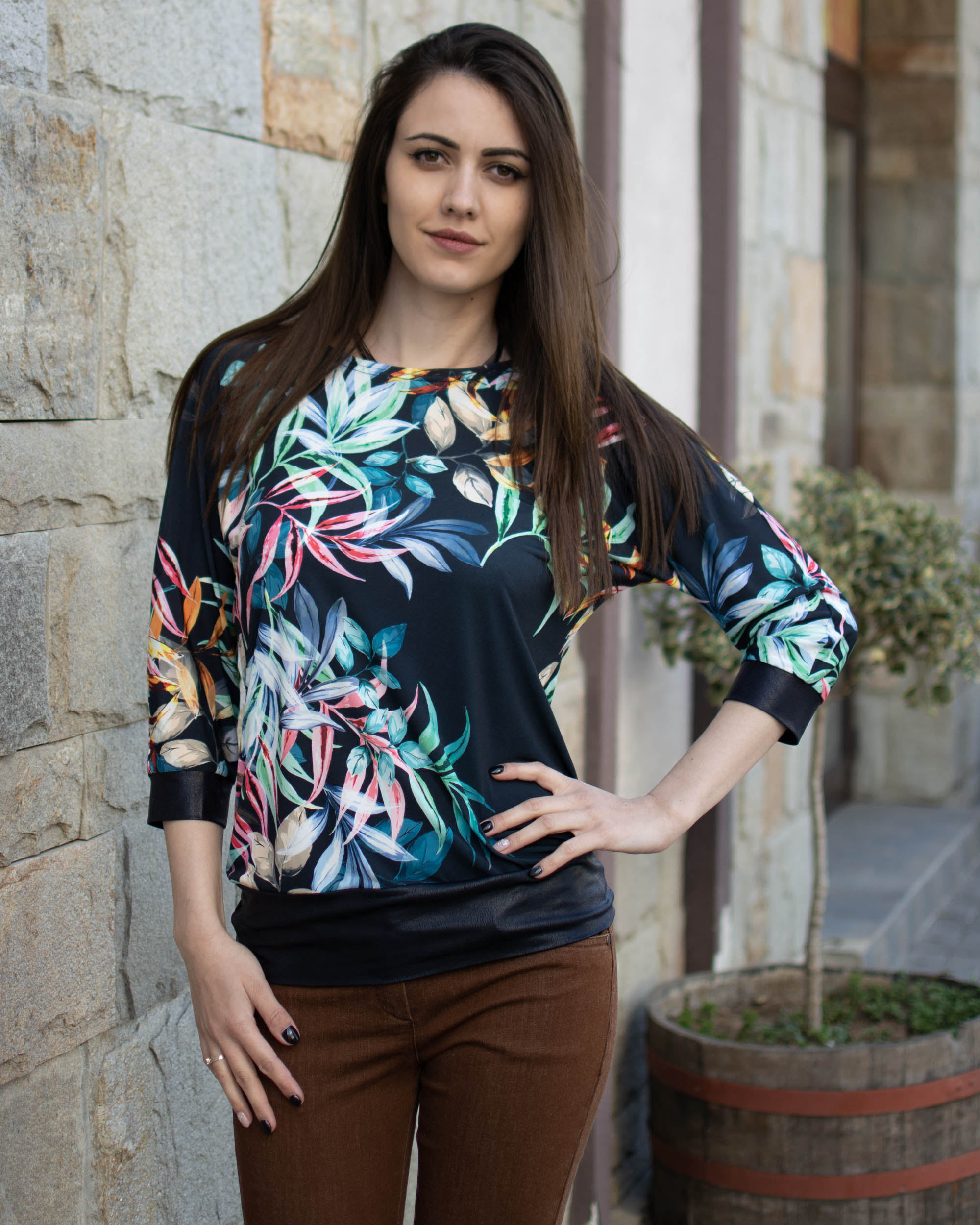 Блуза с ефектна щампа на листа, в съчетание с трикотажна тънка кожа с напукан ефект и 7/8 ръкав.