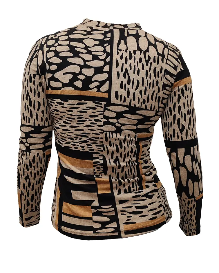 Изразете своя стил с тази модерна дамска блуза с впечатляващ абстрактен десен. Комбинацията от бежово, кафяво и черно придава елегантност и динамика на всяка визия. Изработена е от висококачествена материя, която съчетава комфорт и лекота през целия ден.