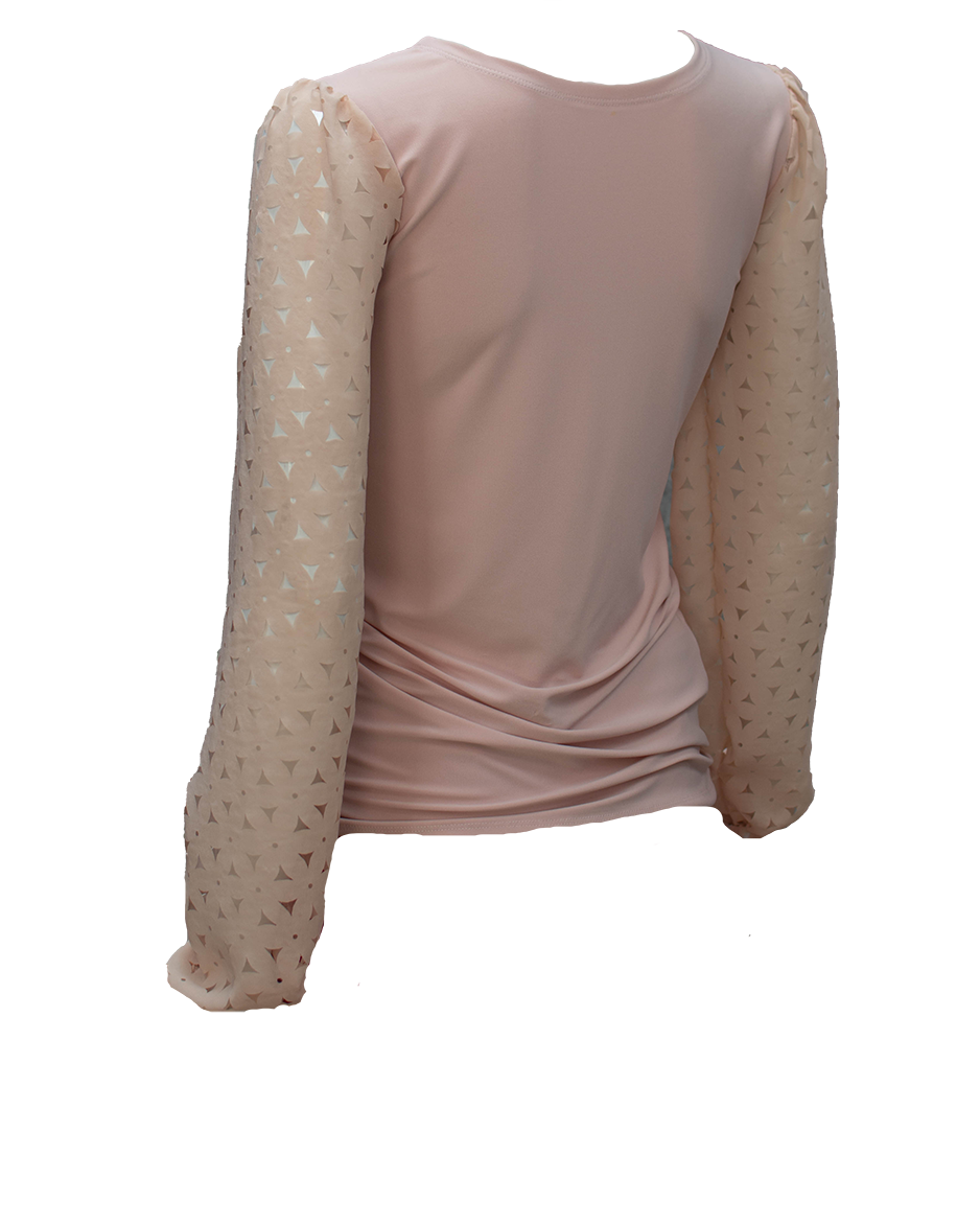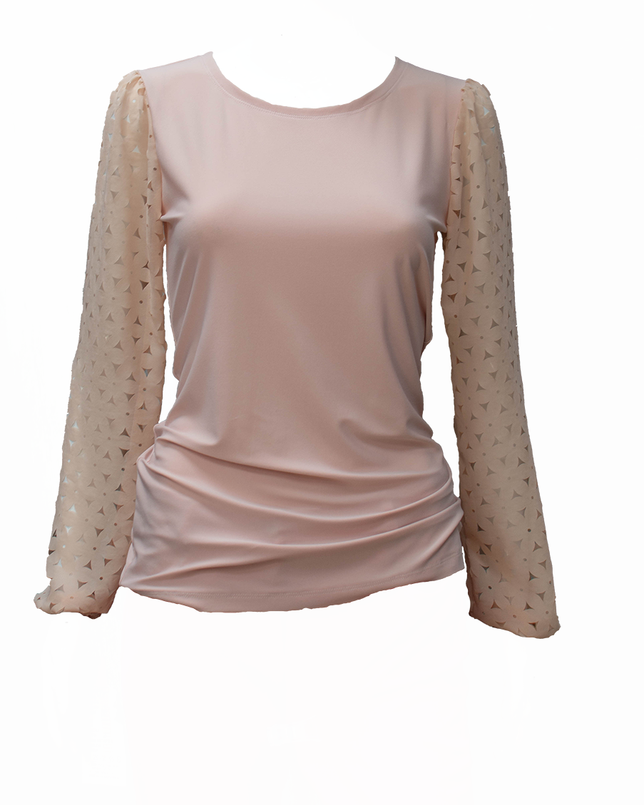 Страхотна дамска блуза с дантелен прорязан ръкав в цвят пудра . Удобна и стилна.