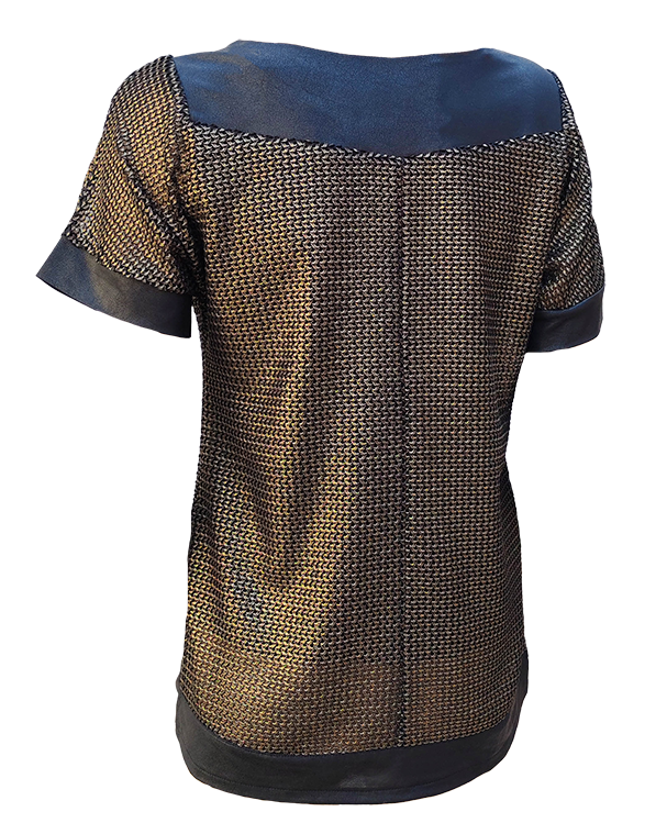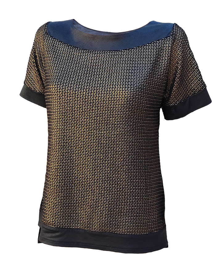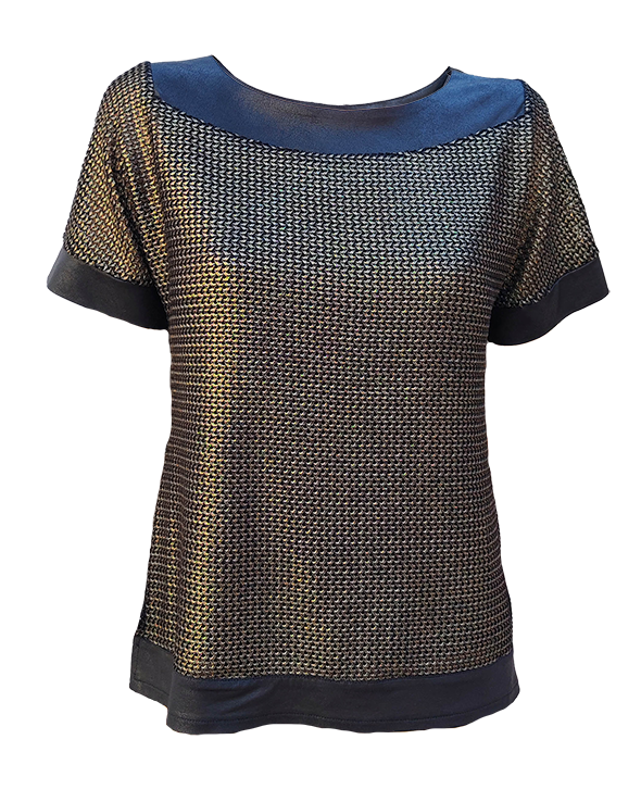 Изразете своя стил с тази модерна дамска блуза с впечатляващ златен десен. Моделът е изработен от от лек и удобен плат с метализиран ефект и геометричен златист мотив, който привлича погледите. Свободната кройка осигурява комфорт и красиво падане, а черните кантове придават модерен и завършен вид. Подходяща за вечерни излизания, празнични поводи и стилни ежедневни комбинации.