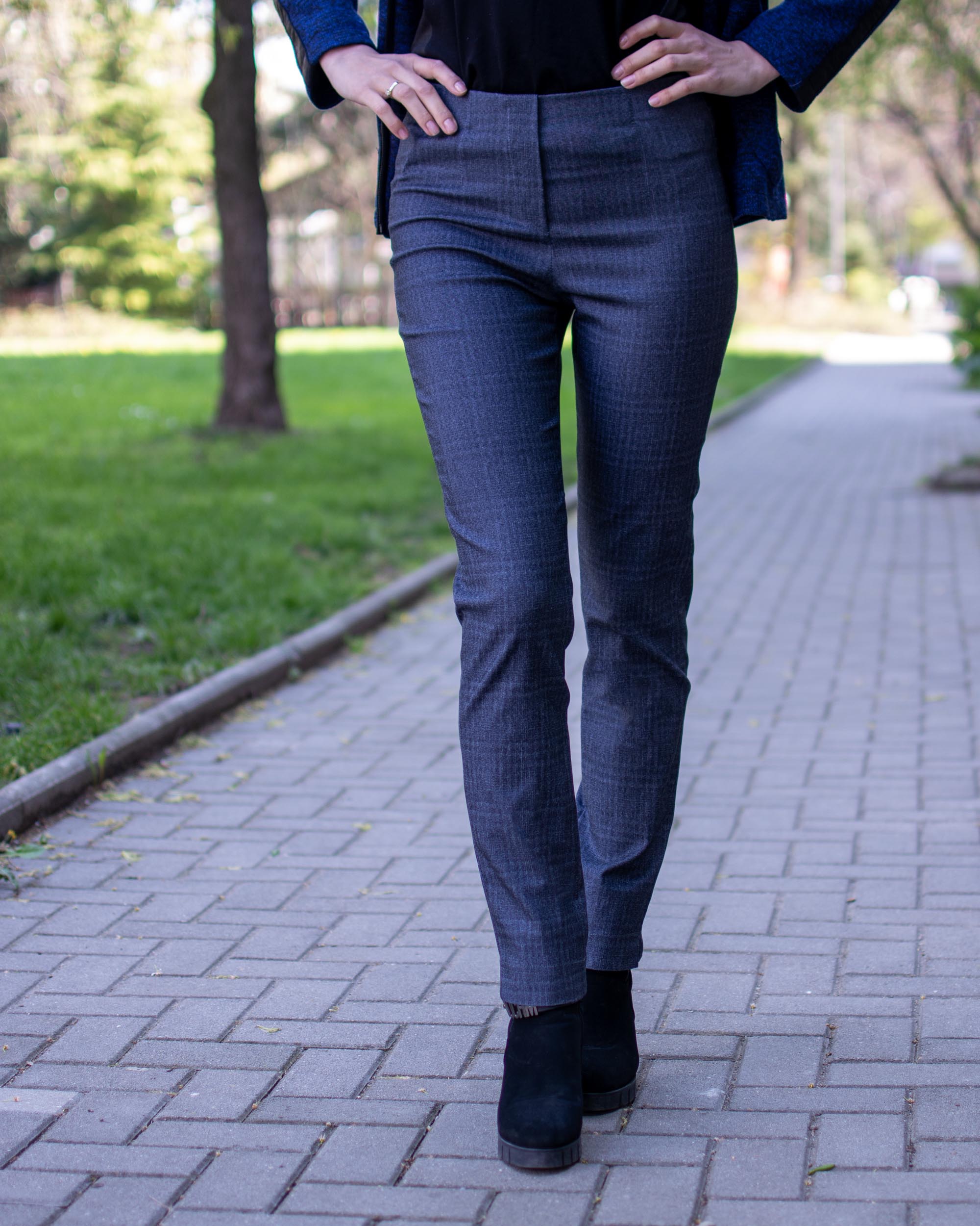 Изчистен дамски панталон от силно еластичен плат наподобяващ дънки с фино изразено каре, висока талия, без цип и със задни джобове.