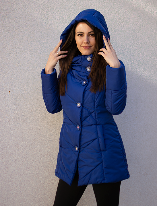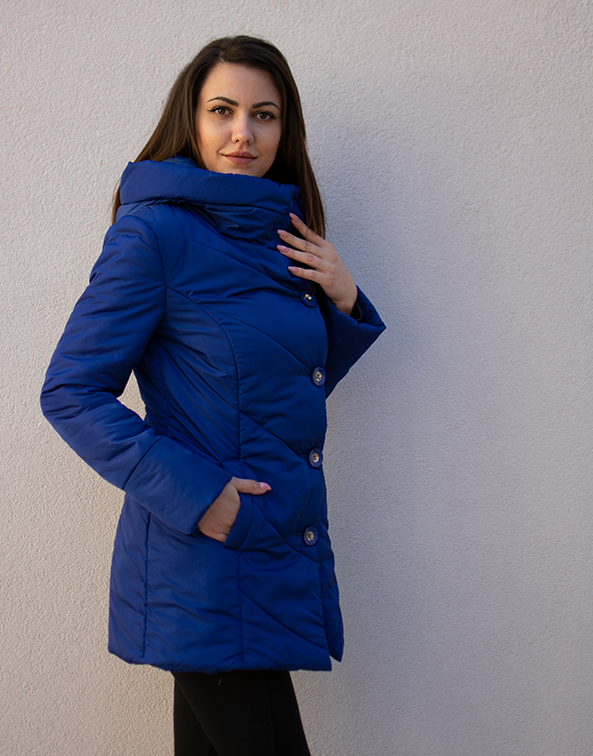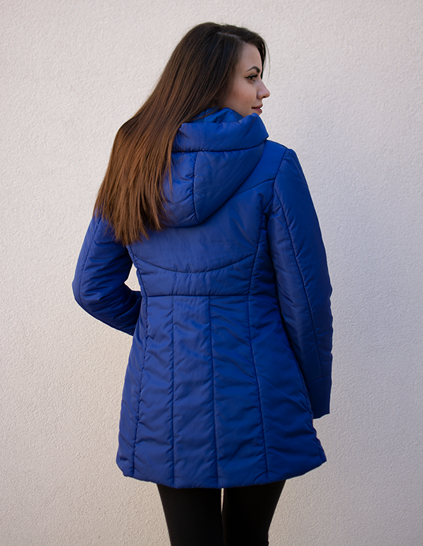 Страхотно дамско яке в син. С висока яка и голяма качулка, предпазващи от студените и влажни дни.