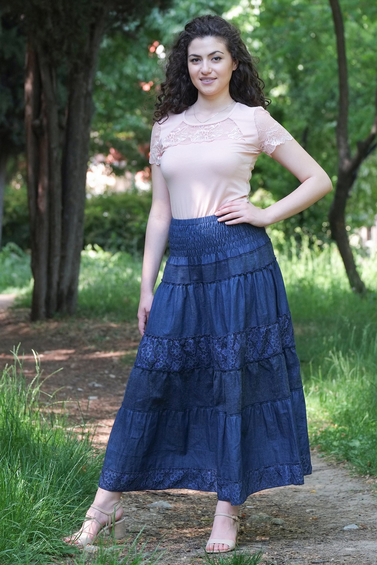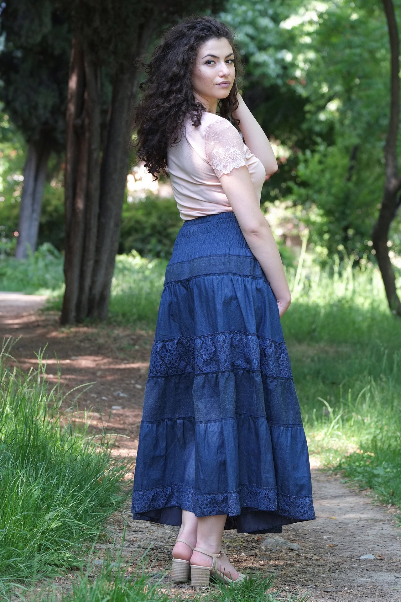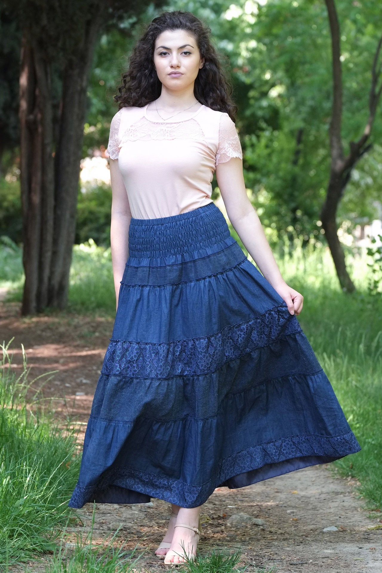 Дълга пола на волани от тънък дънкен плат.В горната част е с ластична платка,което създава удобство при носене.