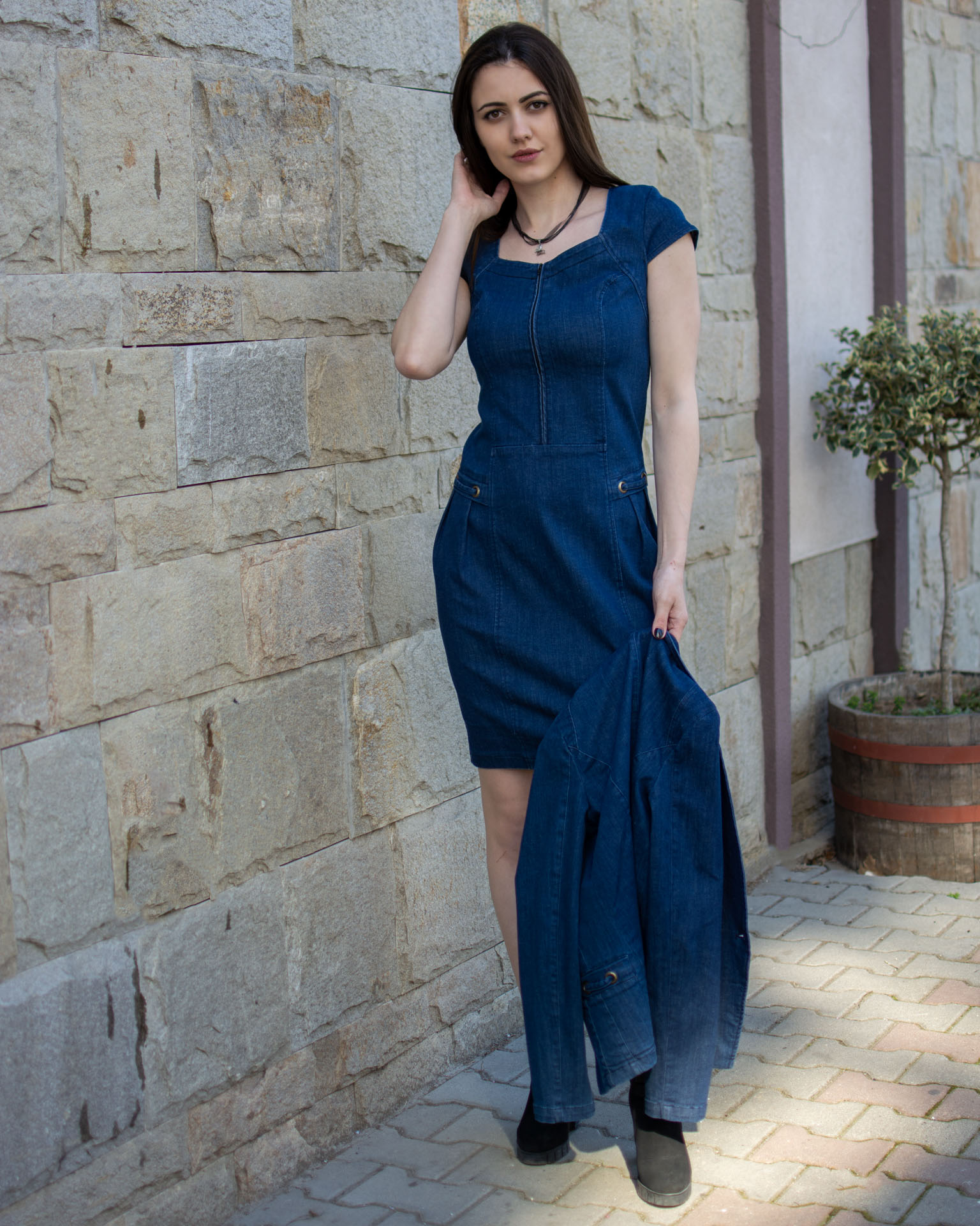 Пролетен дънков сукман от еластична дънкова материя в цвят син с кабси и цип отпред. Дължината на сукмана е от 95см до 102см, в зависимост от размера.