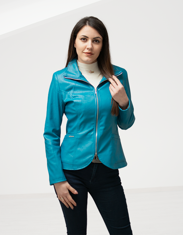 Кожено яке в страхотен нюанс на синия цвят. Удобен и стилен модел, който ще ви впечатли.