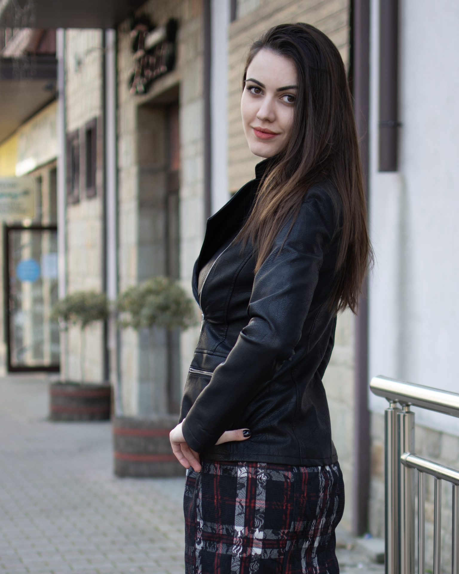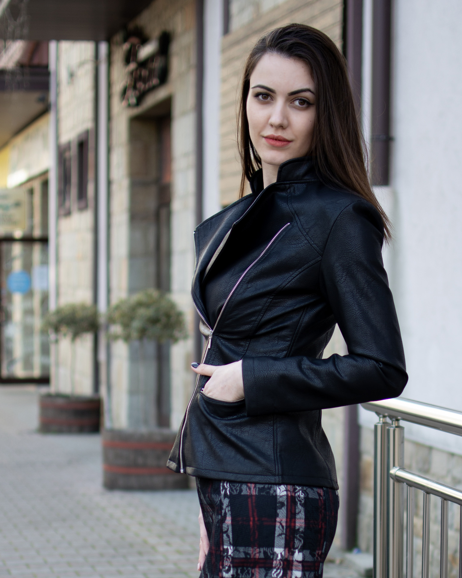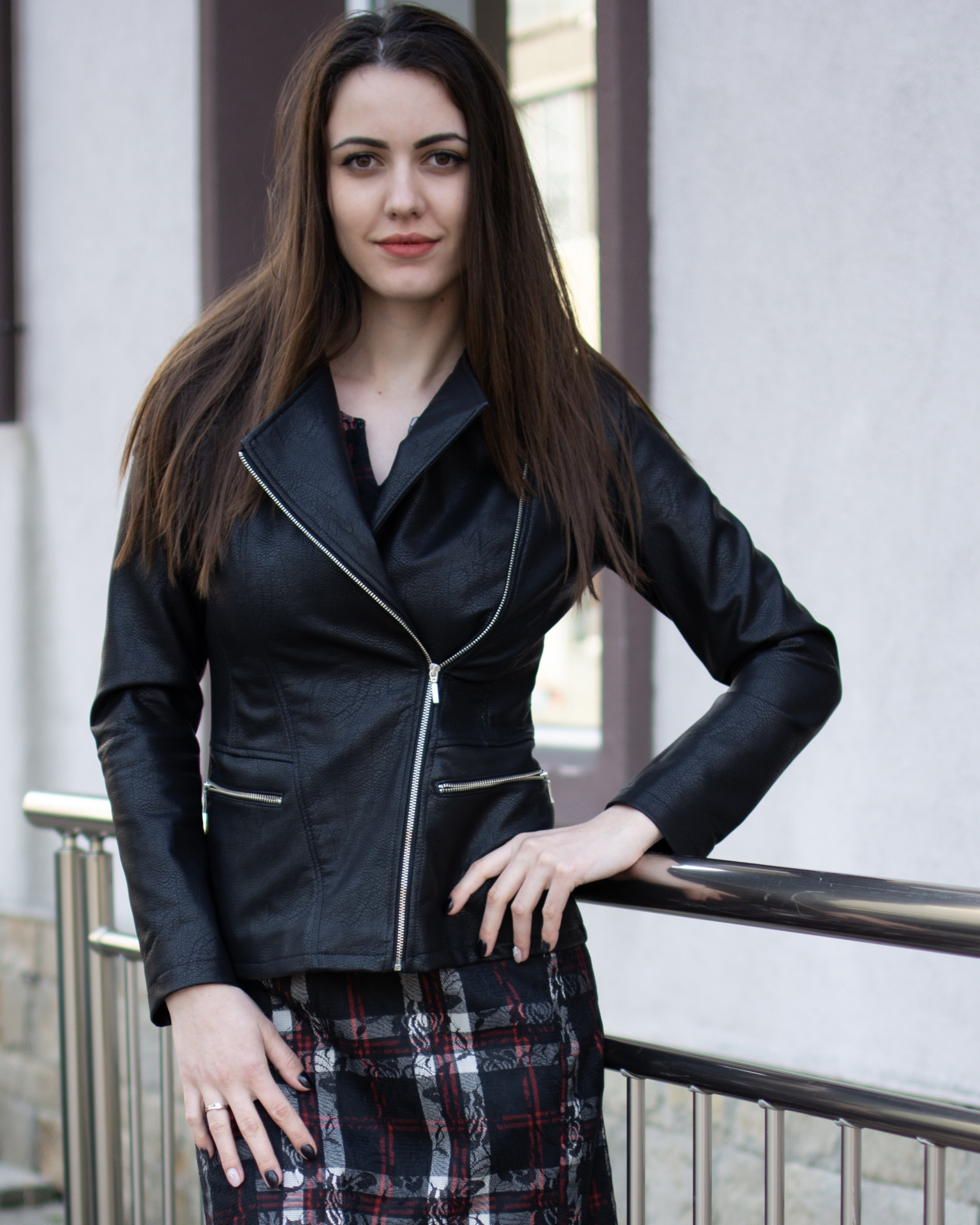 Стилно кожено яке в цвят черен с актуалното странично закопчаване, което може да се пречупи и в ревер.
