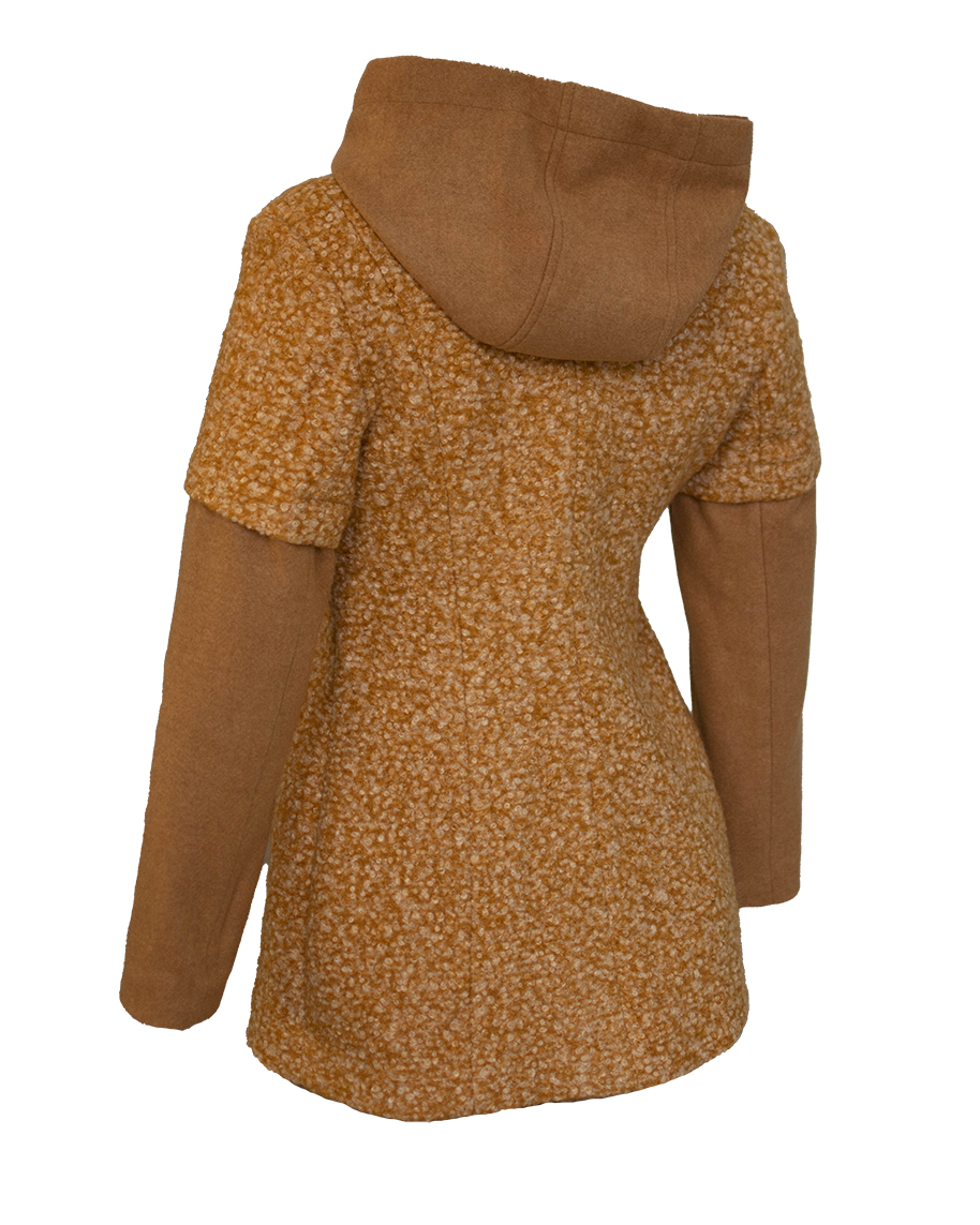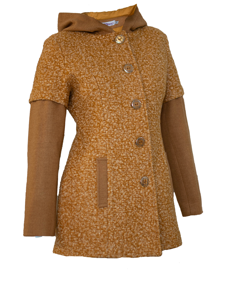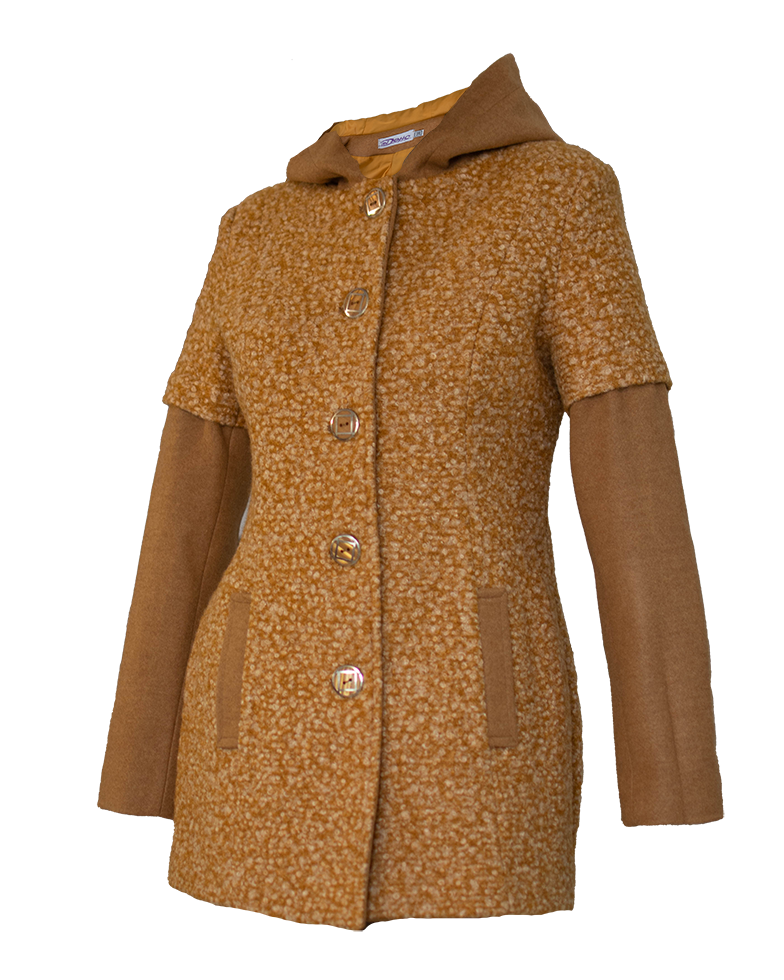 Новото ни предложение за сезона – нашето практично и удобно палто от висококачествено букле, съчетано с вълна, в актуалния за сезона цвят КАМЕЛ.