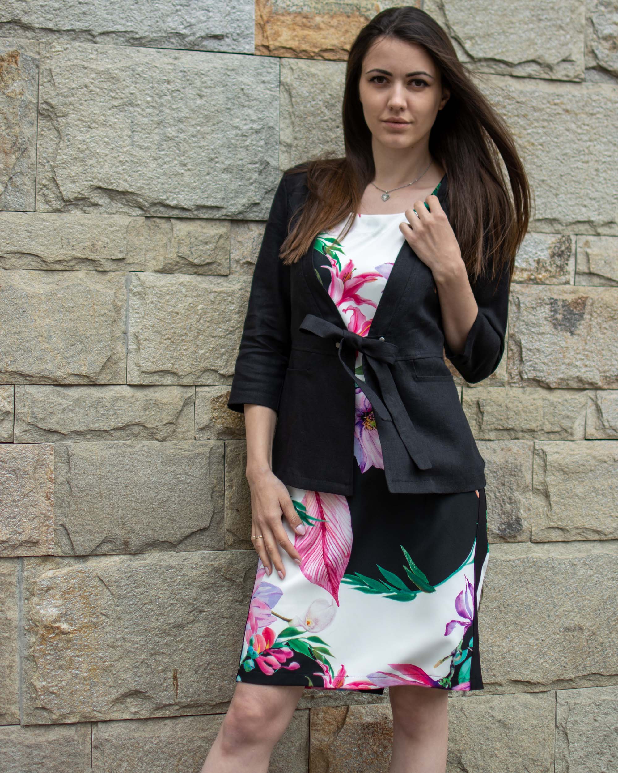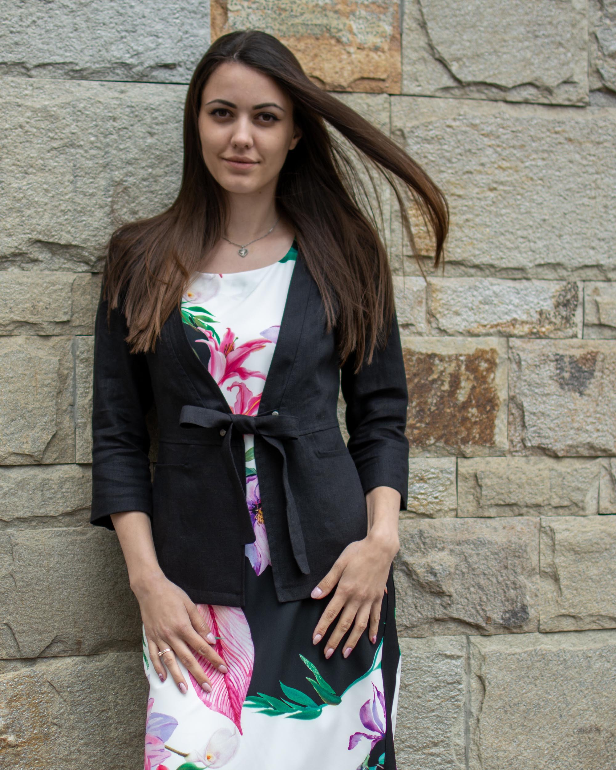 Стилно и елегантно ленено сако с панделка и джобове в черен цвят, подходящо за прохладните летни вечери.