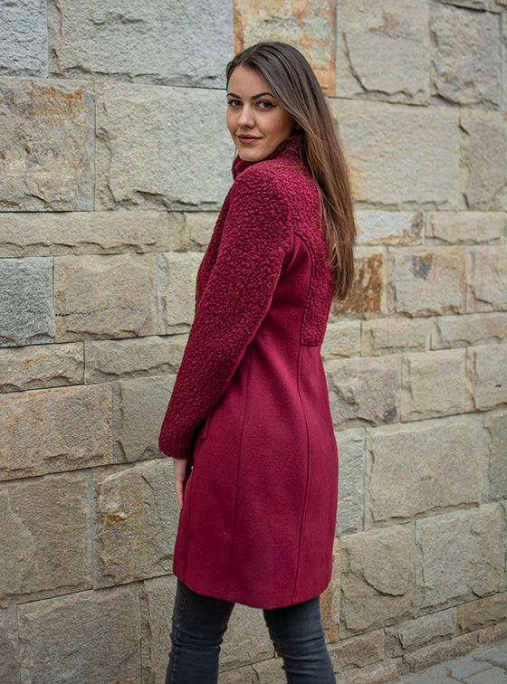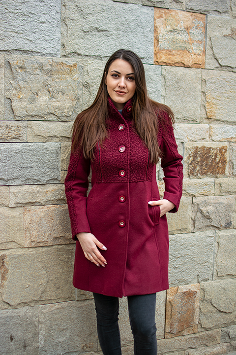 Стилно палто бордо в съчетание от висококачествена вълна и букле.