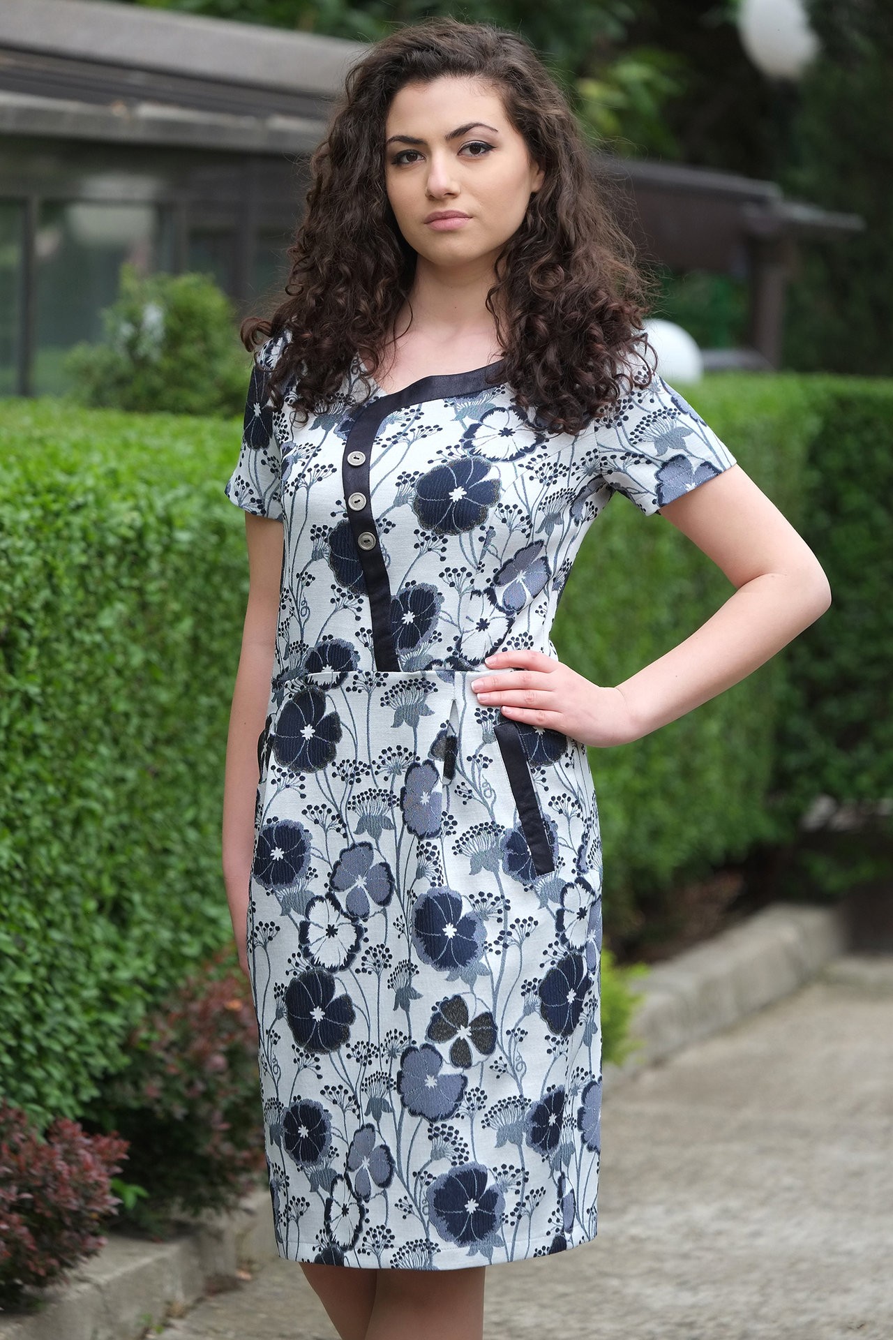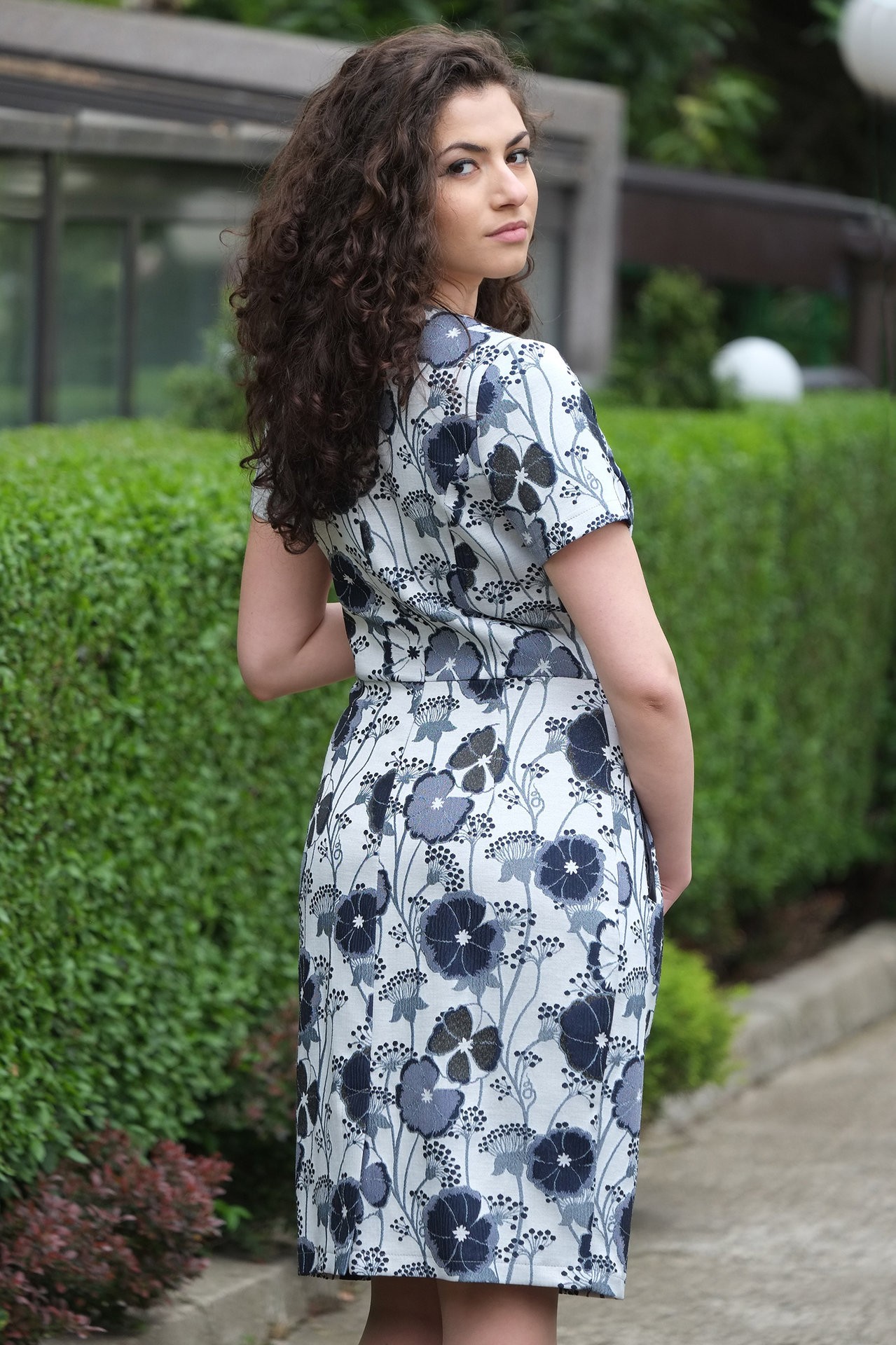 Рокля от жакард на цветя с джоб и асиметрична предна част.