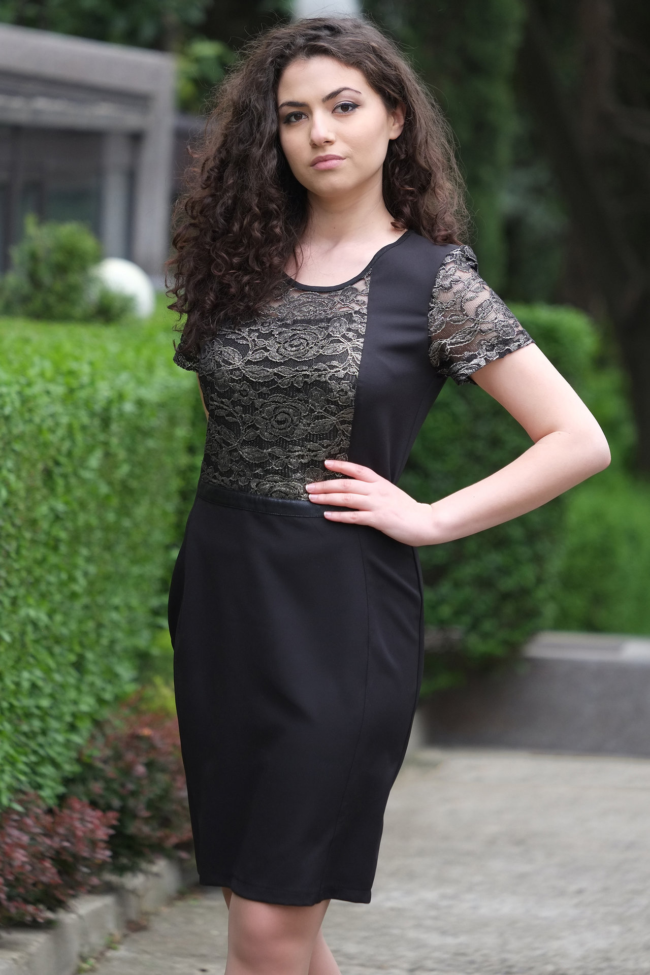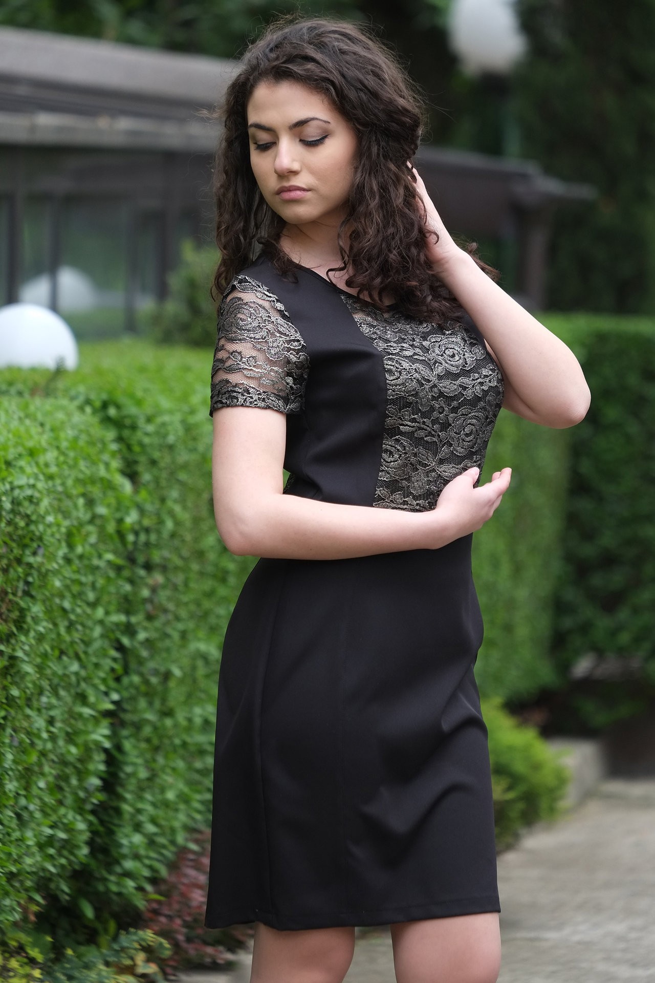 Черна рокля в комбинация със златиста дантела.