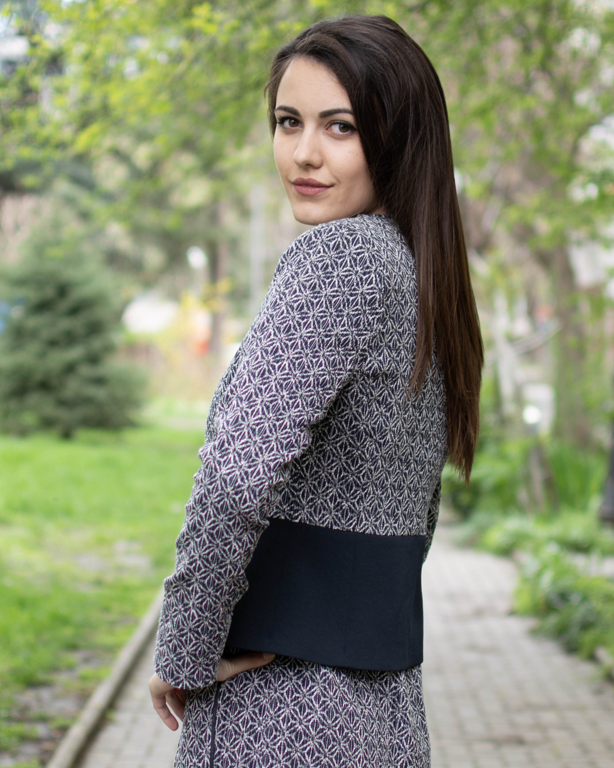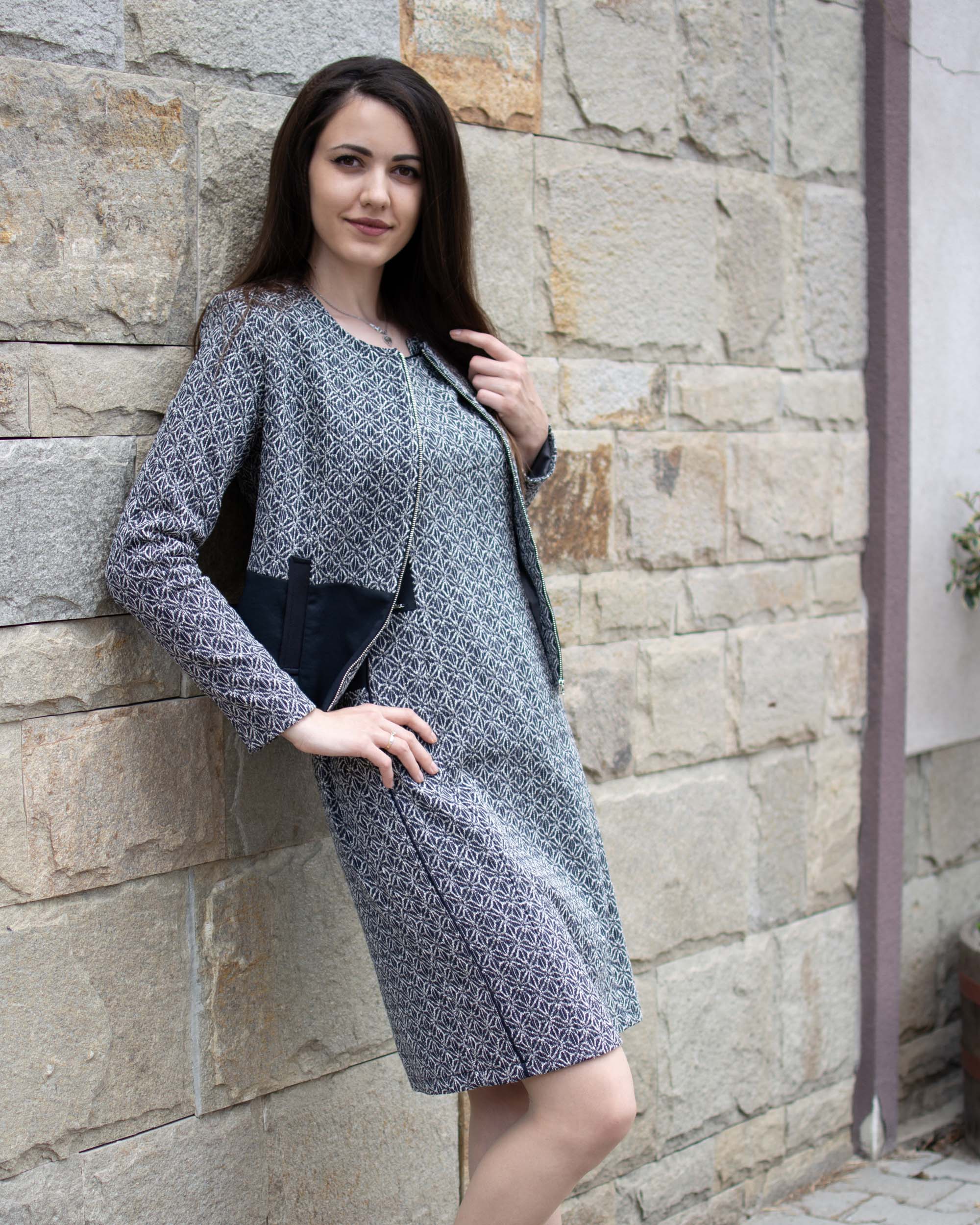 Стилно и елегантно сако, изработено от памучно букле и съчетано със син памучен плат, подходящо както за дънки, така и за рокля.