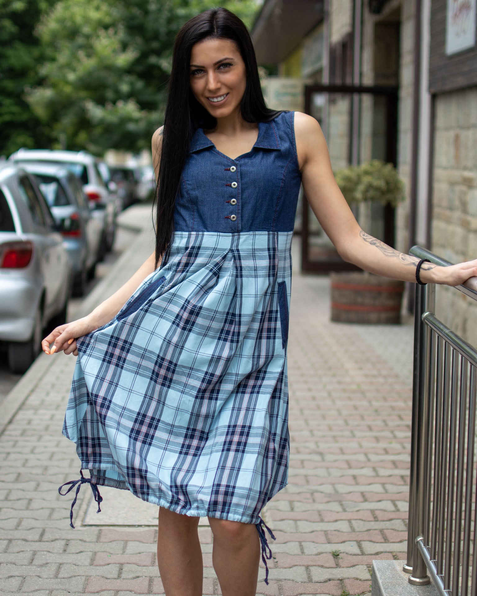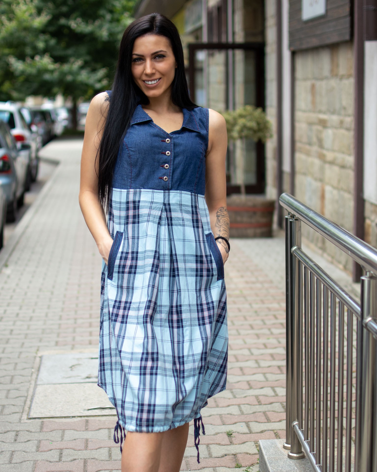 Спортно елегантна рокля в комбинация от дънки и каре, с якичка и джобове.
