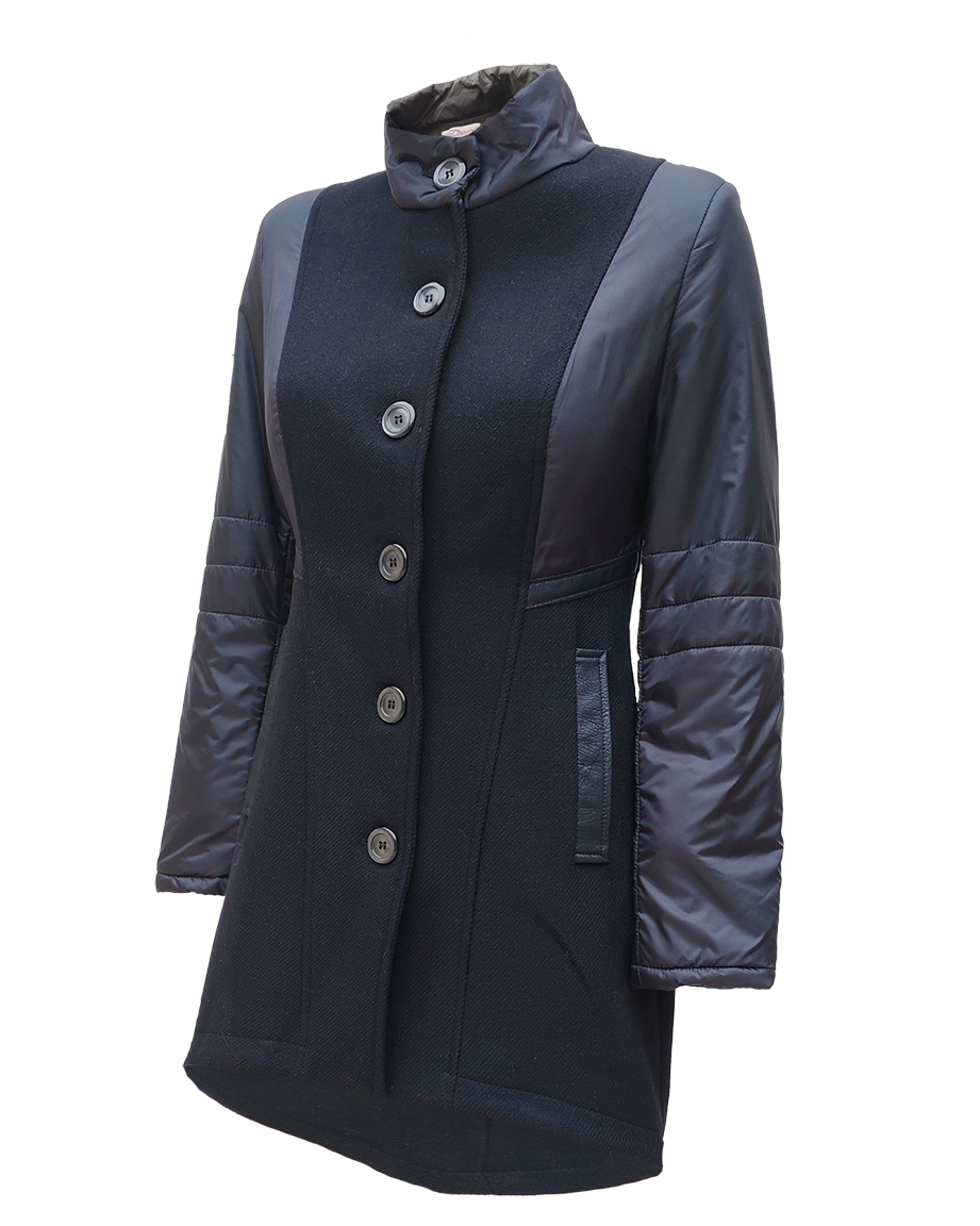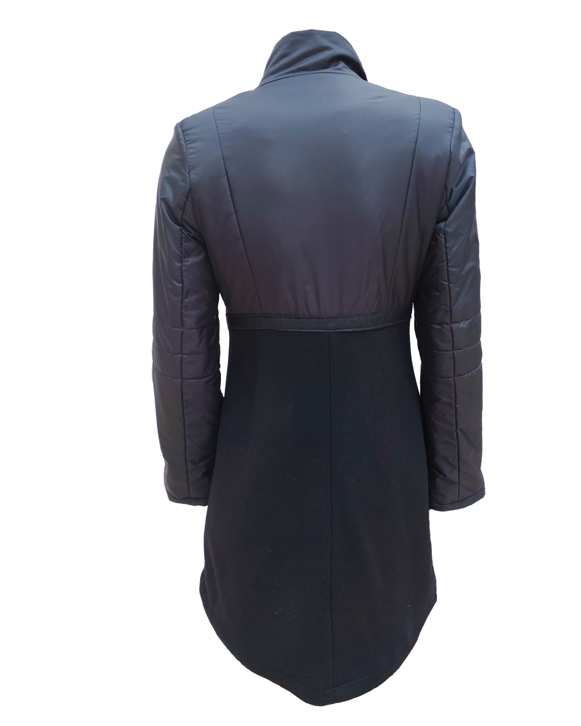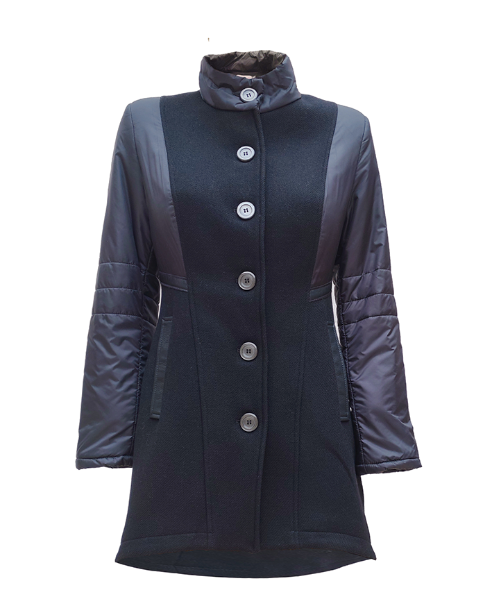 Спортно елегантно палто, което съчетава изискан дизайн и практичност – изработено от висококачествена вълна с шушлякови черни ръкави и акценти, които придават модерен градски стил. Моделът е с изчистена линия, висока яка и ефектни копчета, които подчертават уникалния му характер.
