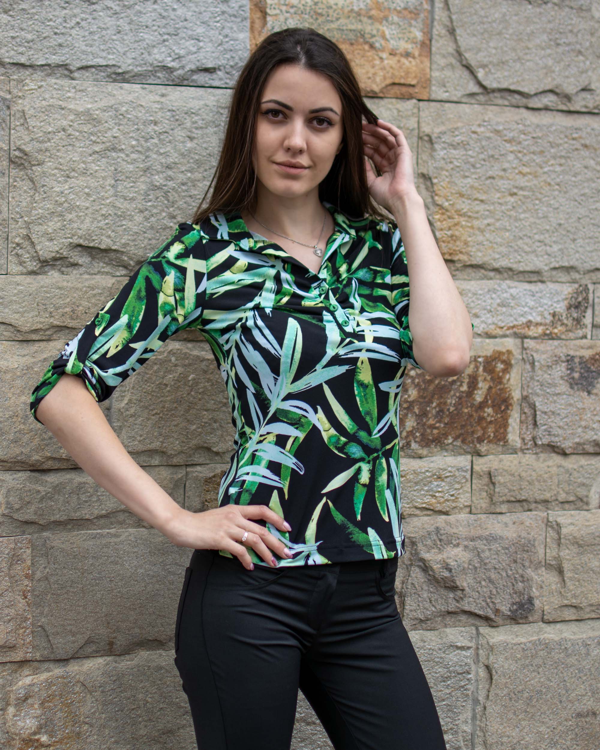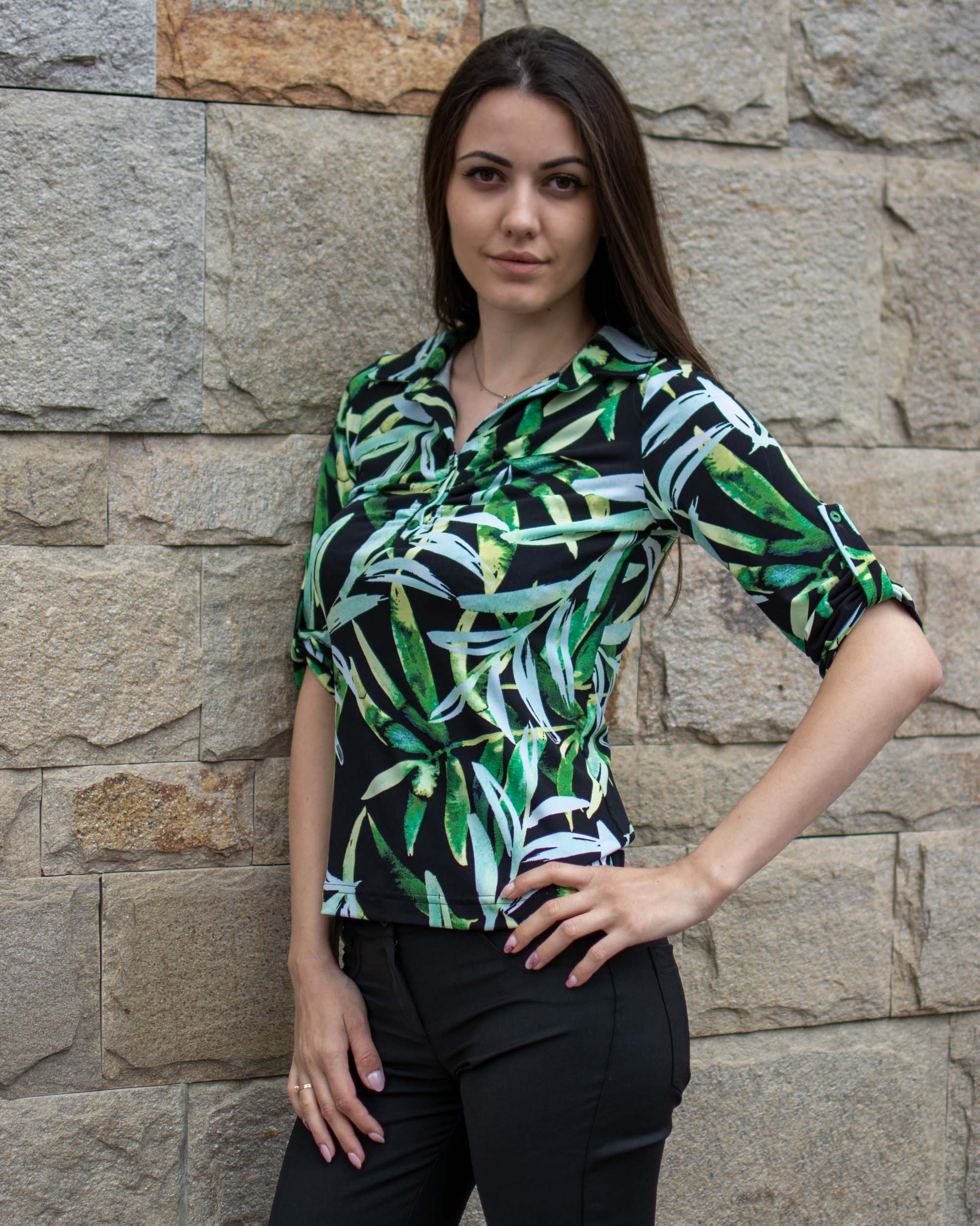 Ежедневна трикотажна риза със щампа на флорални мотиви с втален силует, яка и пластрон.