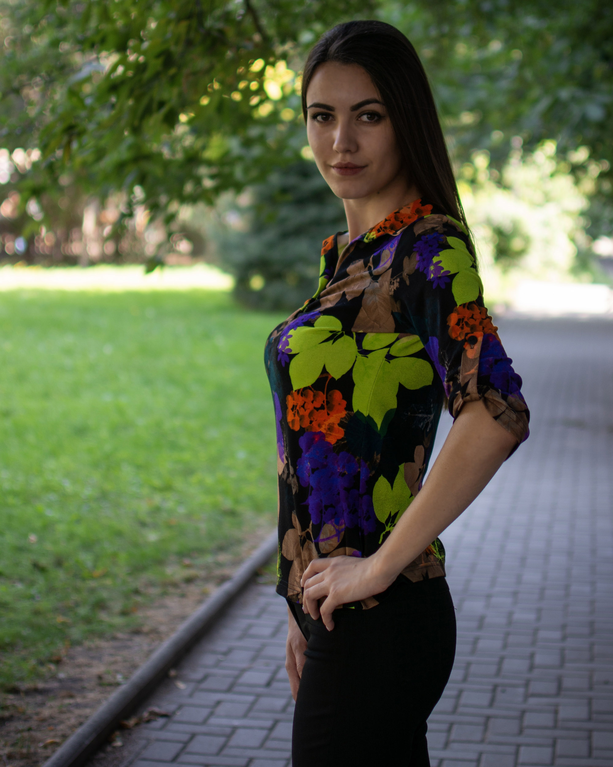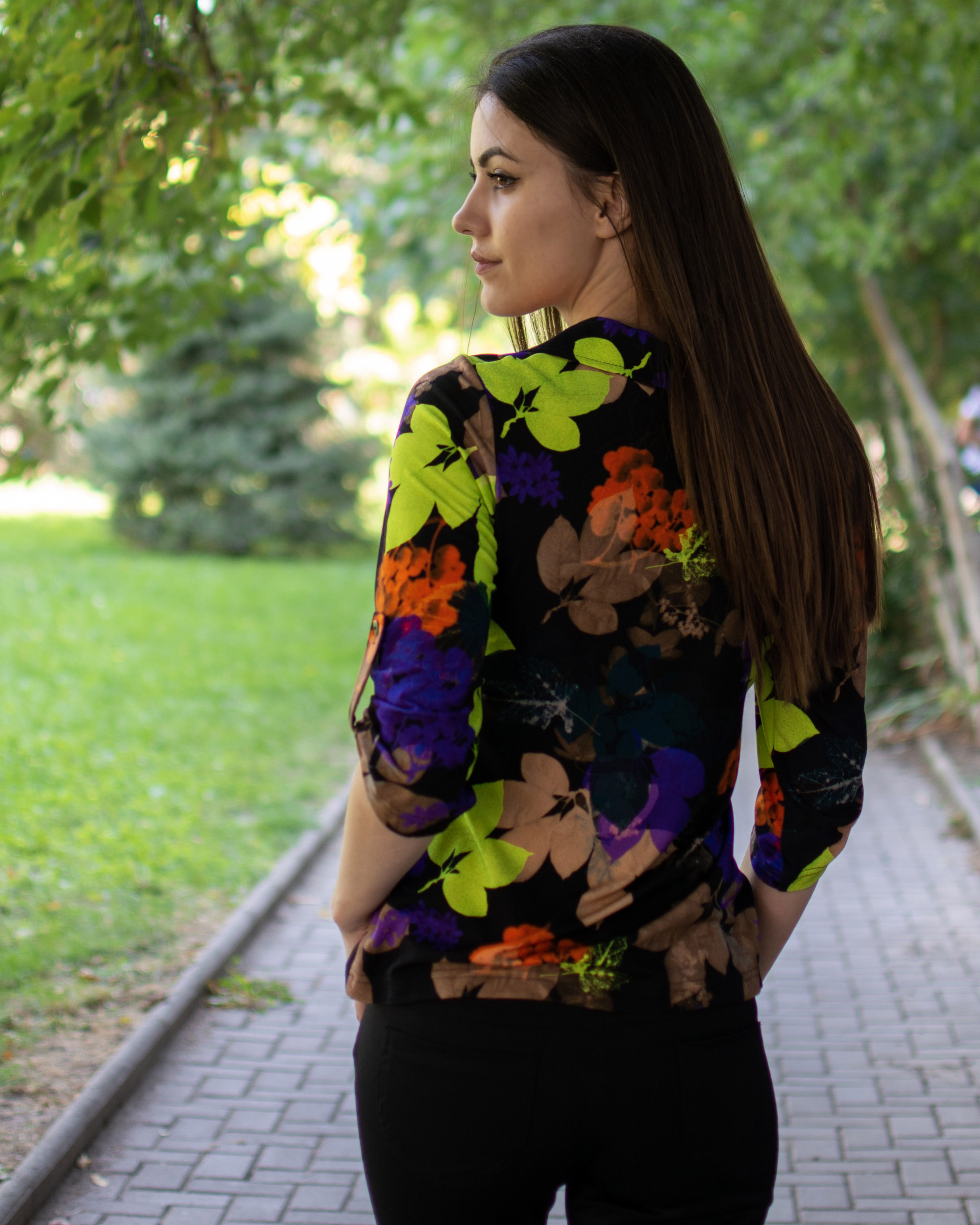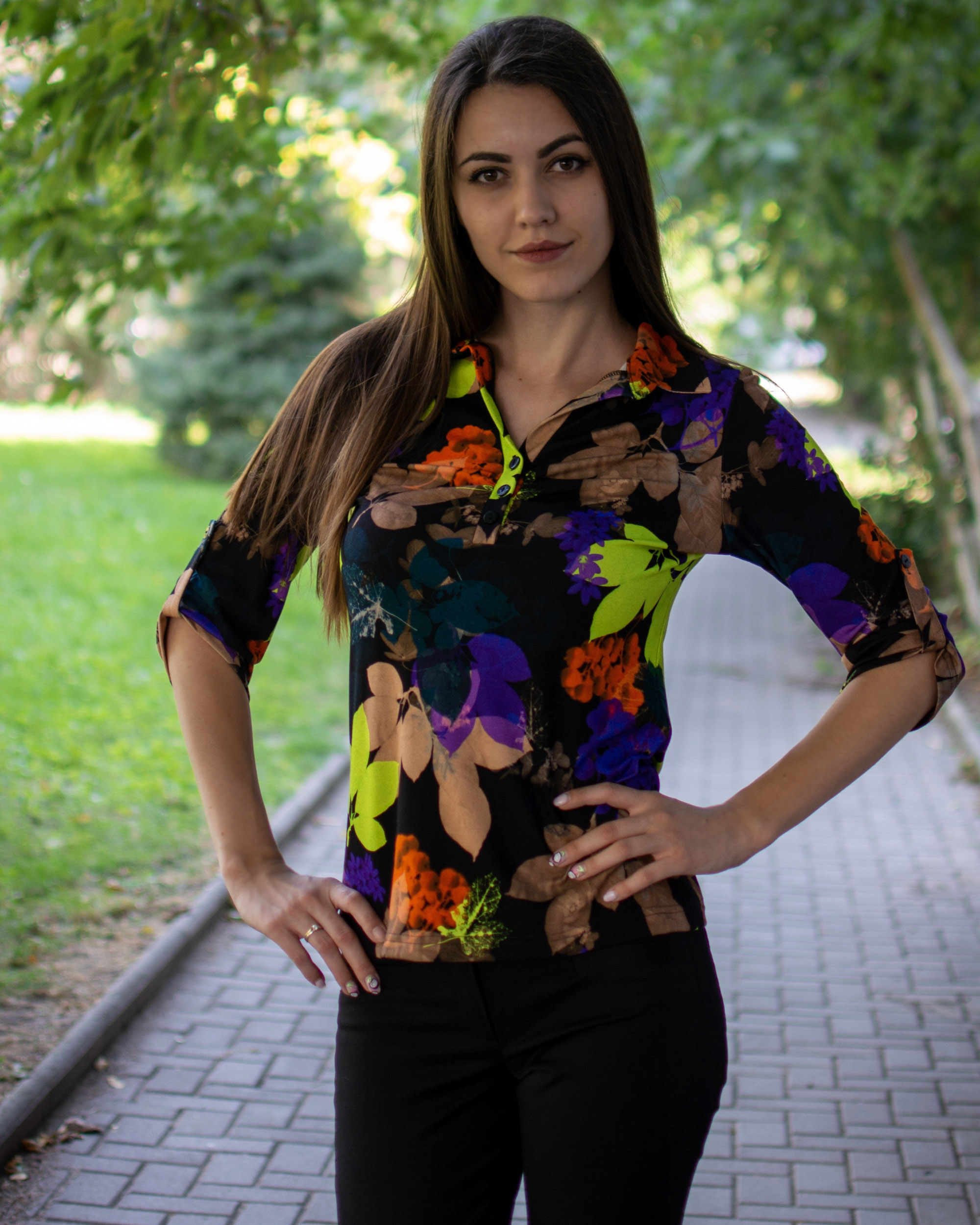 Трикотажна риза с якичка и 7/8 ръкав от фина вискоза с есенни мотиви.