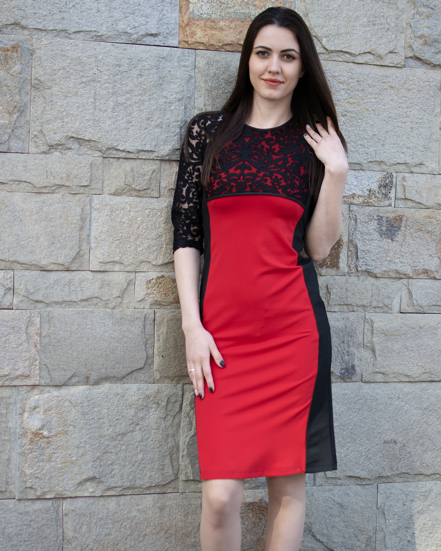 Елегантна червена рокля в комбинация с дантелени ръкави и платка, от еластична Пунто Рома. Дължина на роклята от 105 до 110 см, в зависимост от размера.