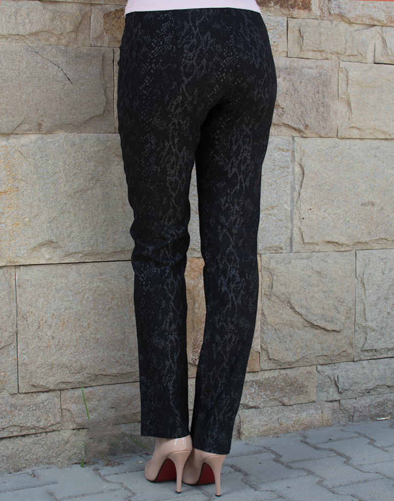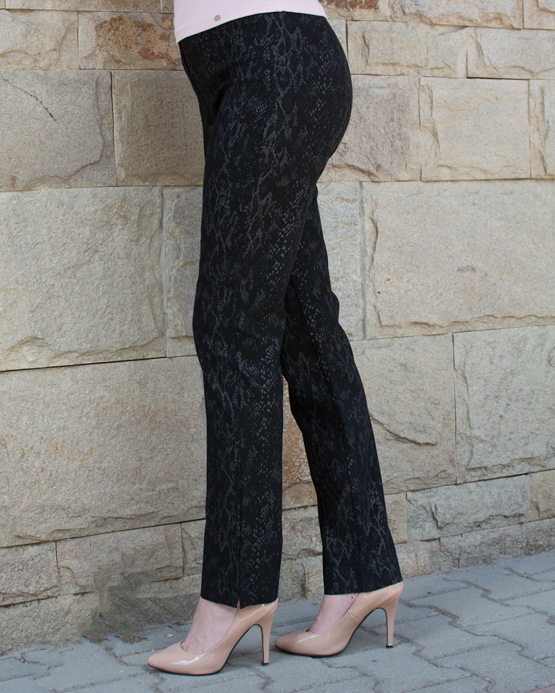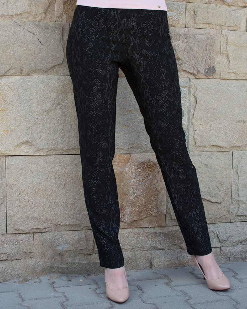 Черен еластичен панталон с принт, класически прав крачол. Придаващ елегантна визия и удобство.