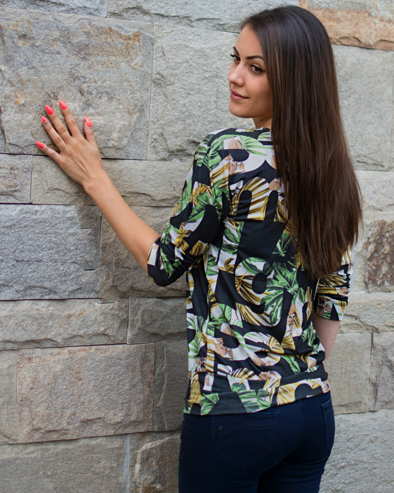 Ежедневна блуза със 7/8 ръкав от приятна и мека вискоза. Щампата е свежа и се съчетава лесно с дънки или спортно елегантен екип.