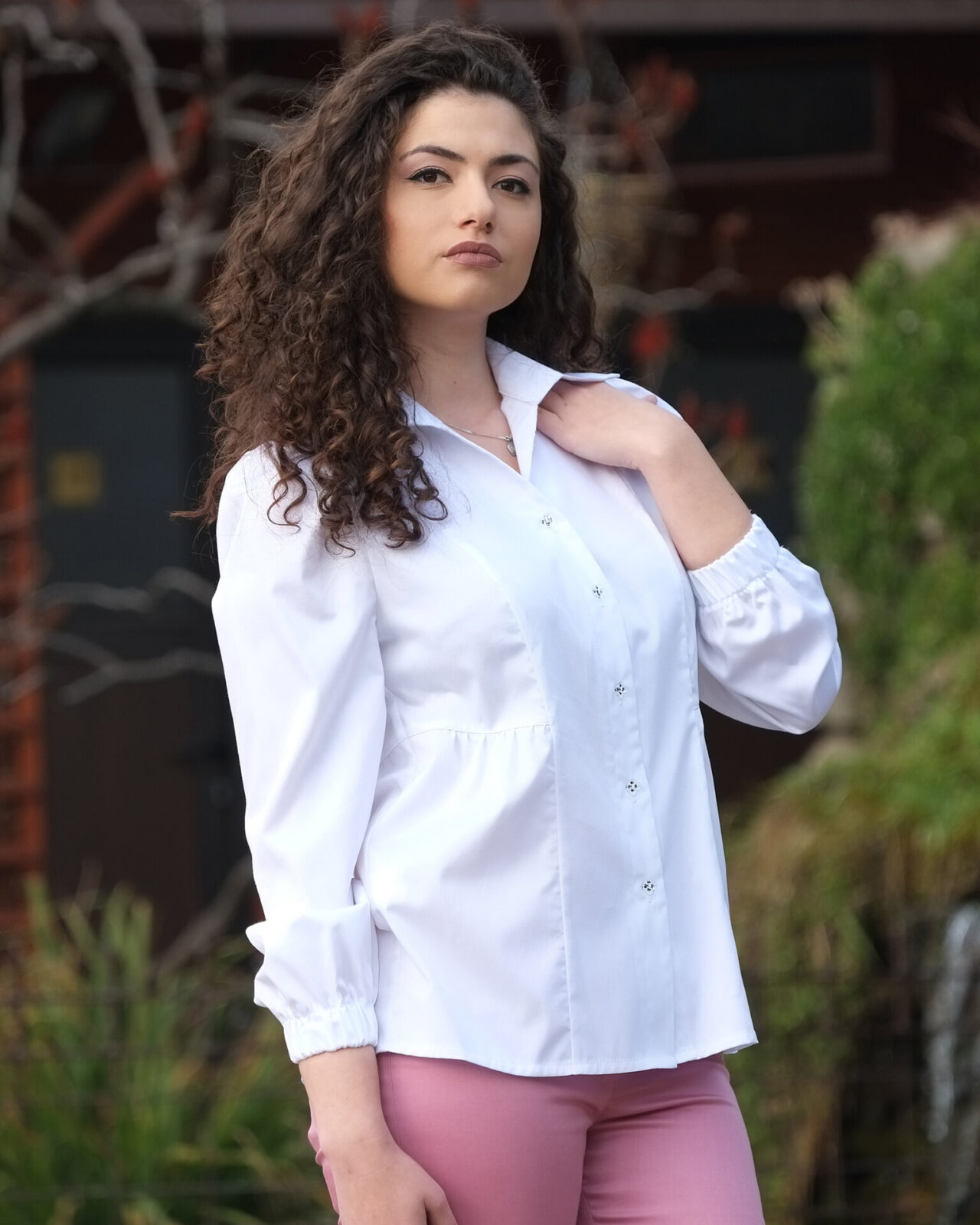 Бяла памучна риза с дълъг ръкав.