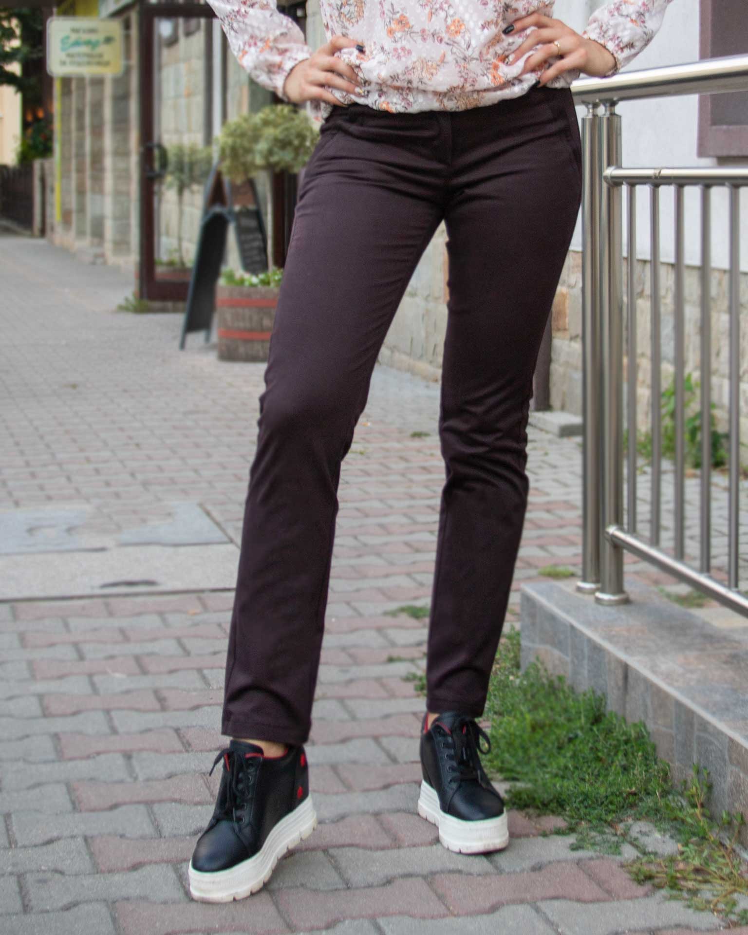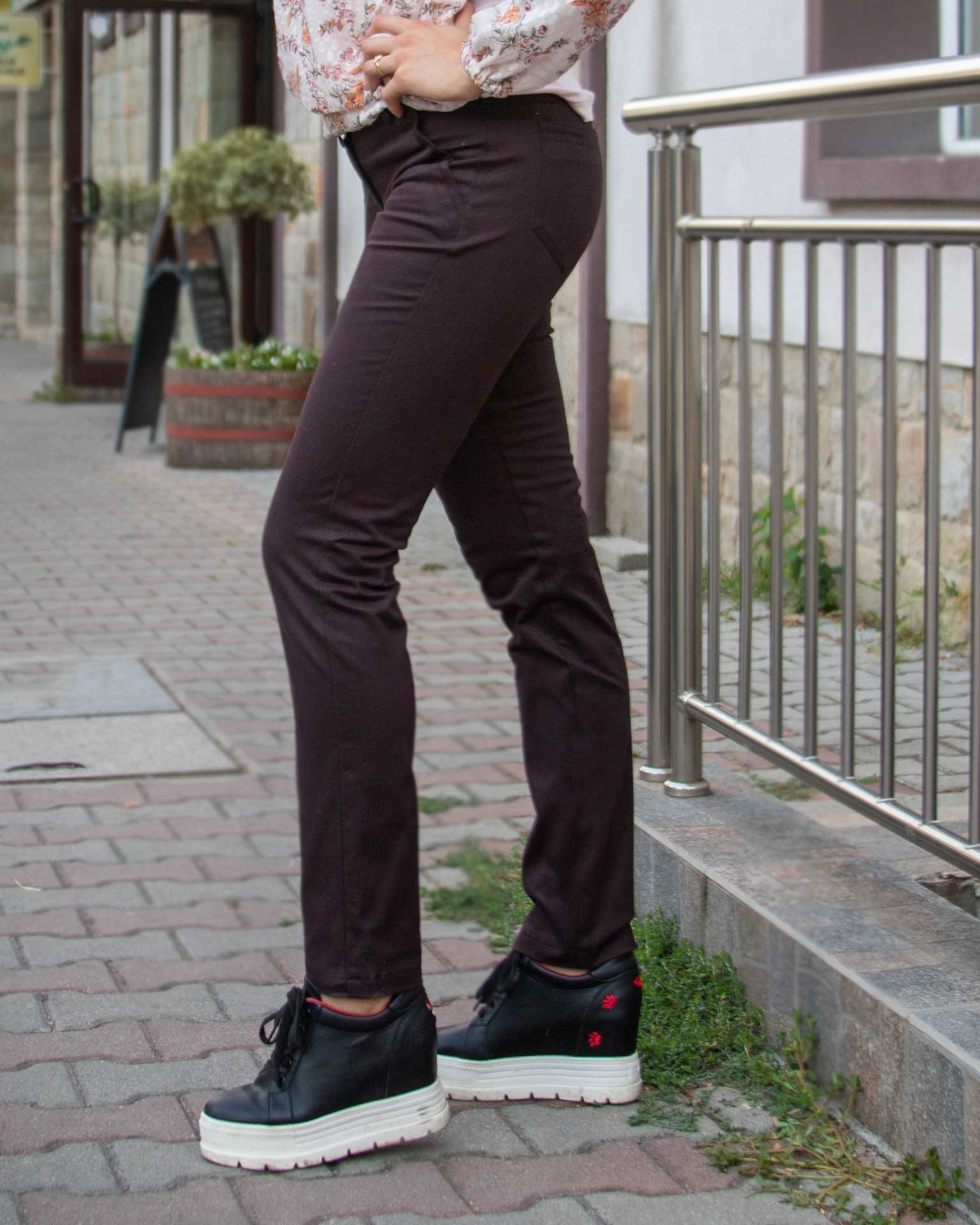 Панталон с изчистена кройка и крачоли с втален силует в тъмно кафяв цвят, подходящ за ежедневието.