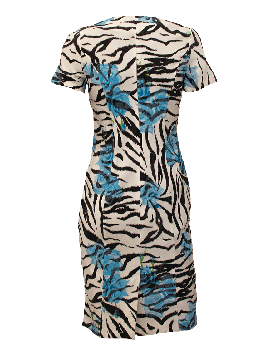 Стилна рокля с артистичен десен и флорални акценти. Съчетава изискан силует с впечатляващ артистичен десен в класическа черно-бяла гама.