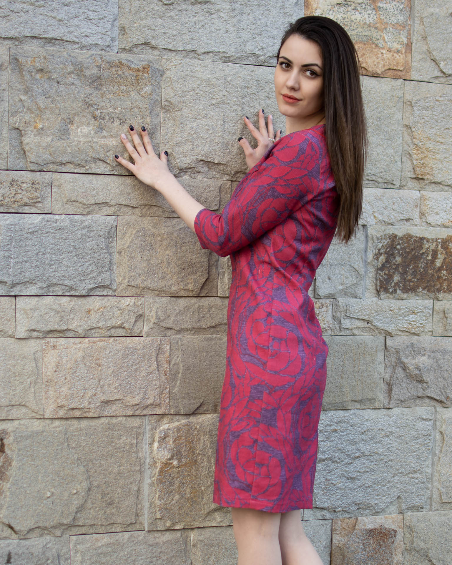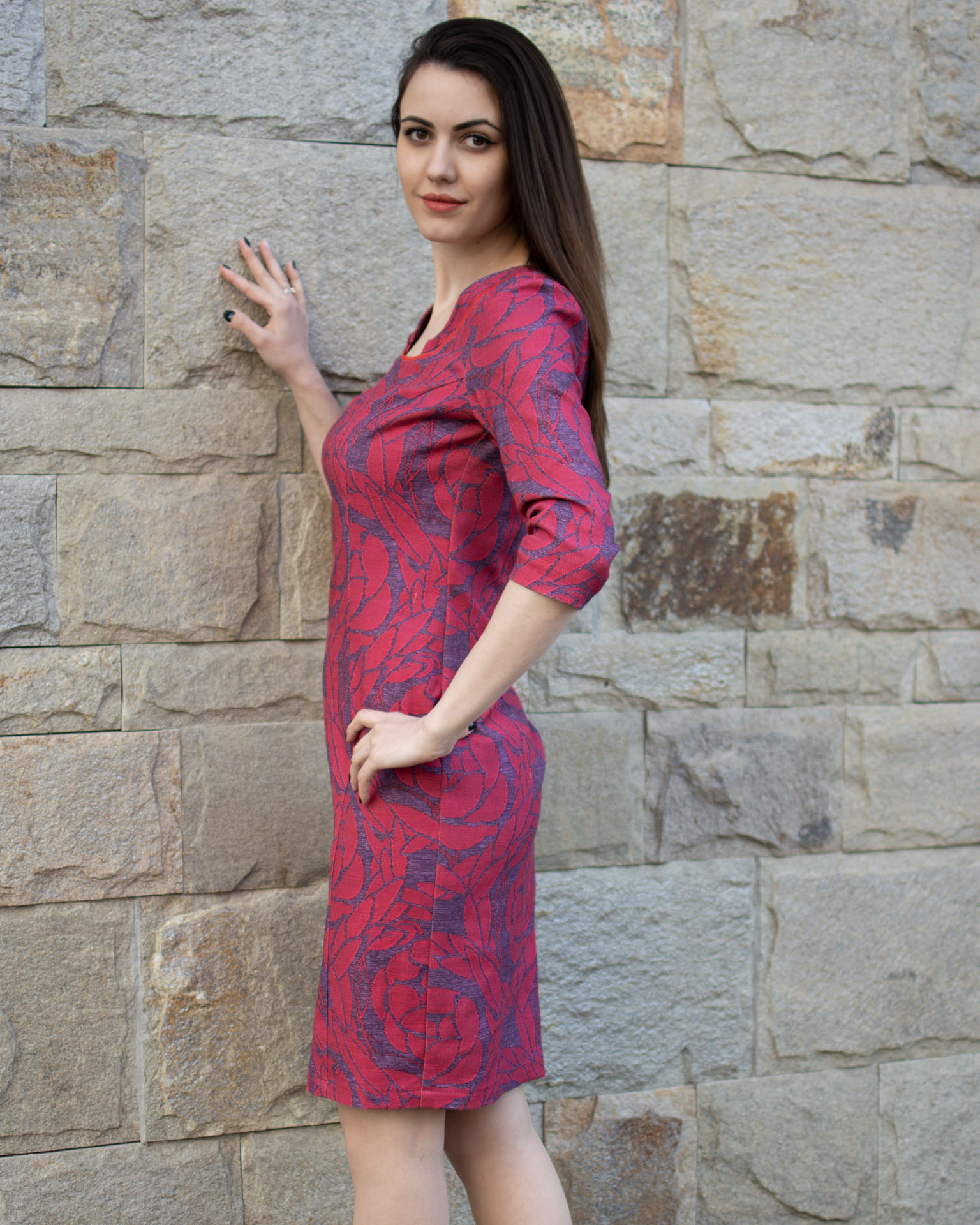 Дамска рокля от памучна материя с флорална щампа, в актуалната цветова комбинация от циклама и лилаво. Дължината на роклята е от 100см до 106см, в зависимост от размера.